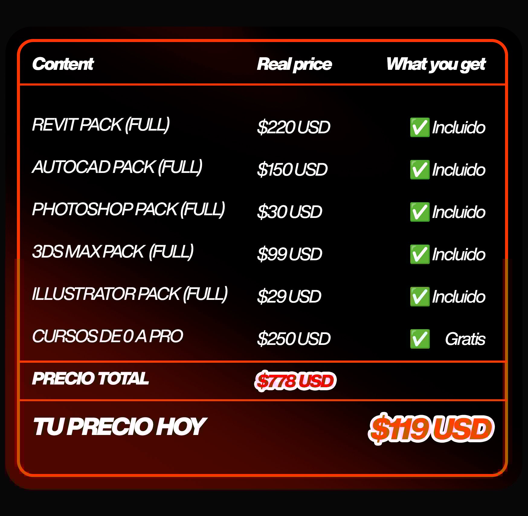 Mega Pack Pro Arquitecto ᴇs99Porciento13 ratingsEnglish version here 🡥$119119usd-77% DescuentoQuedan 11 Cupos con precio de lanzamiento$520520usdPrecio Original Cantidades Ilimitadas2119usdBuy thisPay in 2 installments2 equal monthly installments of $59.5025 salesObtienes: Mega pack arquitectoSize1.6 MBLength2 pagesAdd to wishlist New wishlistShareShare on XShare on Facebook Copy linkCopy product URL7-day money back guaranteeRatings5(13 ratings)1355 stars100%4 stars0%3 stars0%2 stars0%1 star0%