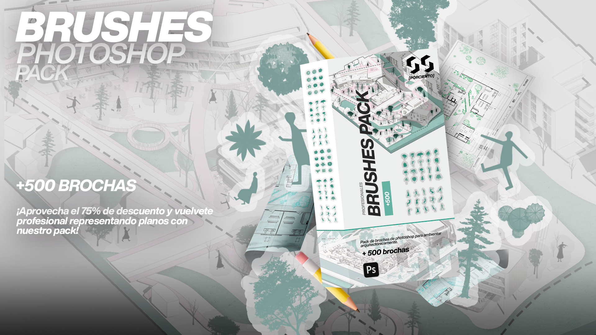 Transforma tus diagramaciones con brushes de árboles, personas, mobiliario y más. Perfecto para elevar la estética de tus láminas en minutos.